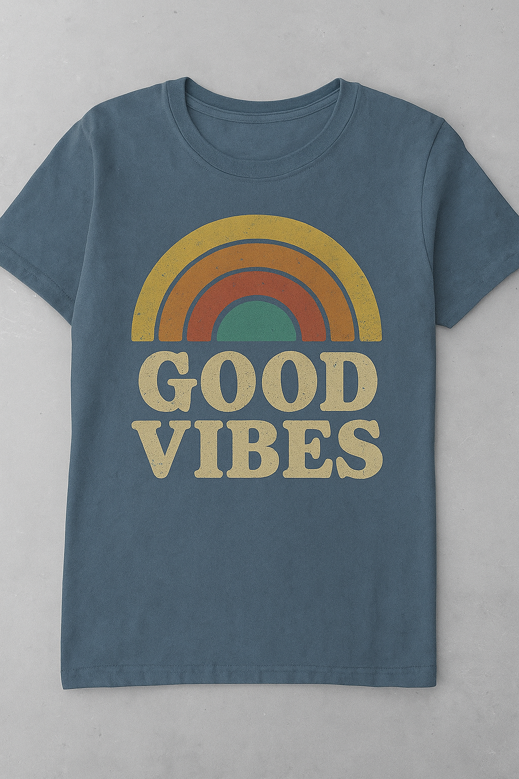 Spread positivity with the Good Vibes Retro Tee. Featuring a vintage rainbow graphic in warm earthy tones and bold distressed lettering, this T-shirt is perfect for casual outings or relaxed weekends. Crafted from soft cotton fabric, it delivers both comfort and timeless retro style.